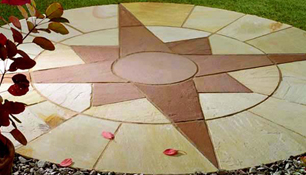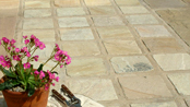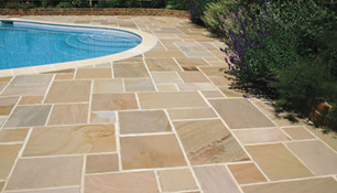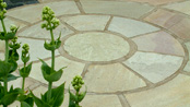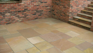 An Indian sandstone paving with a blend of light mint, cream, yellow and orange tones with some spot...